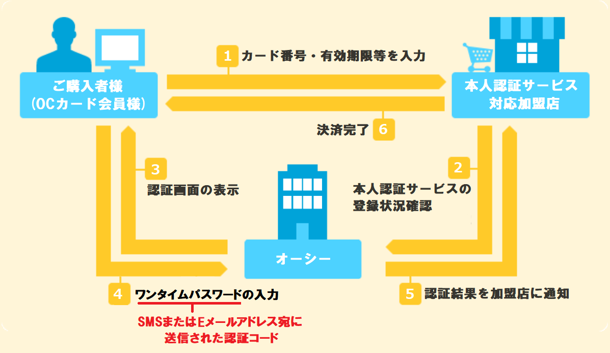 本人認証サービスとは、オンラインショッピングでのカード決済時に、お客様ご本人のご利用であることを確認する為のセキュリティ機能です。カード番号等のご入力に加えて、SMS(ショートメッセージ)またはご登録のEメールアドレス宛に送信された、ワンタイムパスワード認証を行うことにより、第三者の不正利用を防ぎます。
